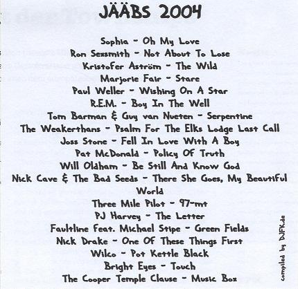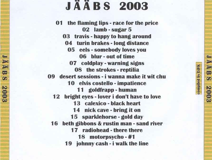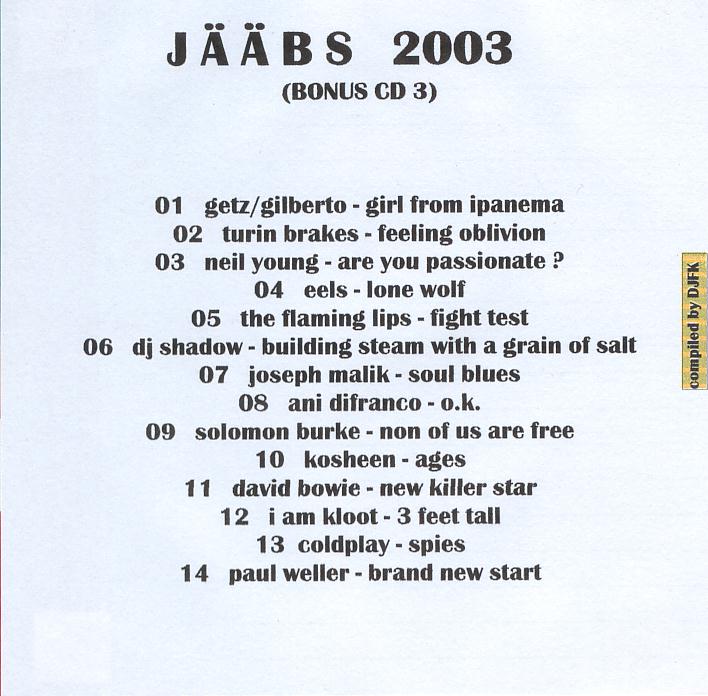 Jääbs ist die alljährliche Zusammenstellung von Musik, die ich mir in dem jeweiligen Jahr zugelegt habe. Es sind nicht unbedingt die besten Songs einer CD/LP, aber vielleicht die wichtigsten.